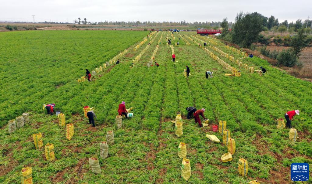10月12日,靖边县东坑镇沙渠村村民在收获紫萝卜(无人机照片)。