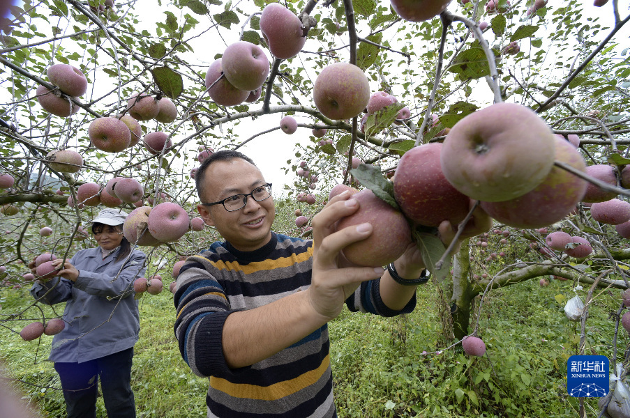 10月21日,在贵州省威宁彝族回族苗族自治县牛棚镇龙山种植专业合作社的苹果园,曹杰(右)和村民一起采摘糖心苹果。