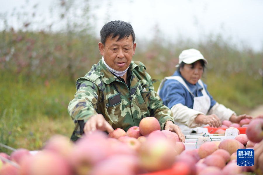 10月21日,在贵州省威宁彝族回族苗族自治县牛棚镇龙山种植专业合作社的苹果园,曹杰的父亲曹宣明(左)和村民分拣刚采摘的糖心苹果。新华社记者 杨楹 摄