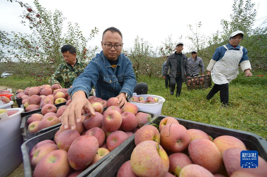 10月21日,在贵州省威宁彝族回族苗族自治县牛棚镇龙山种植专业合作社的苹果园,曹杰(左二)在分拣刚采摘的糖心苹果。新华社记者 杨楹 摄