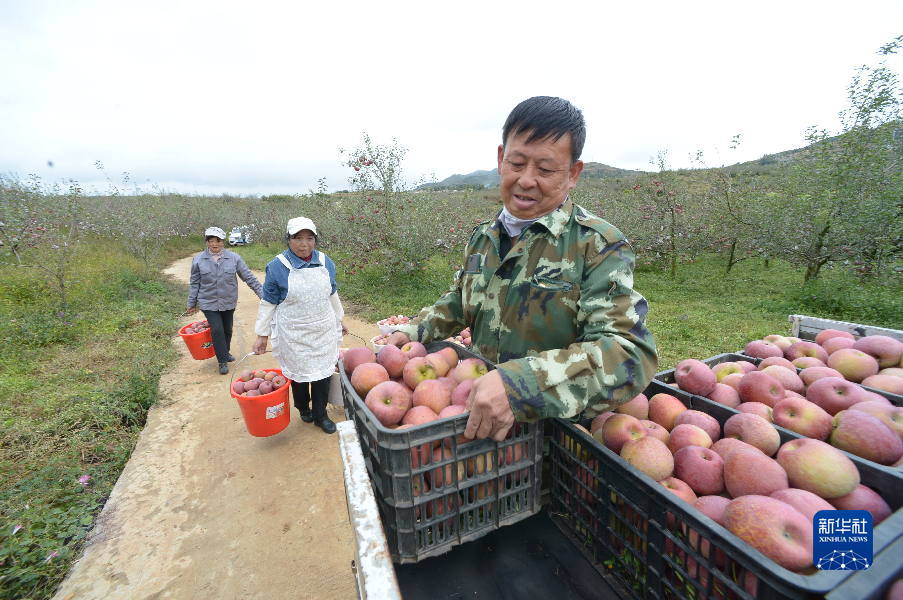 10月21日,在贵州省威宁彝族回族苗族自治县牛棚镇龙山种植专业合作社的苹果园,曹杰的父亲曹宣明(右一)和村民将刚采摘的糖心苹果装车。新华社记者 杨楹 摄