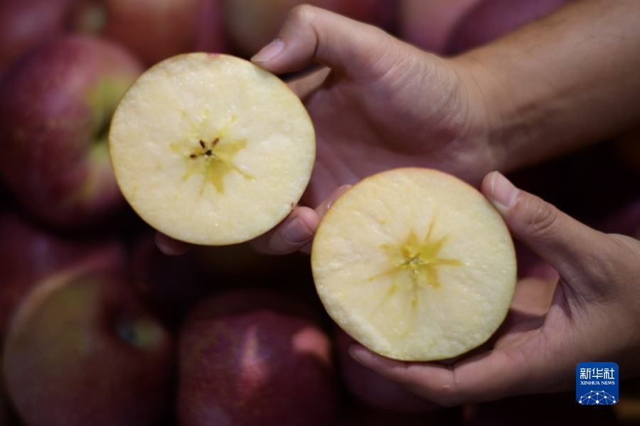 10月21日,在贵州省威宁彝族回族苗族自治县牛棚镇龙山种植专业合作社的苹果园,曹杰展示刚采摘的糖心苹果。新华社记者 杨楹 摄