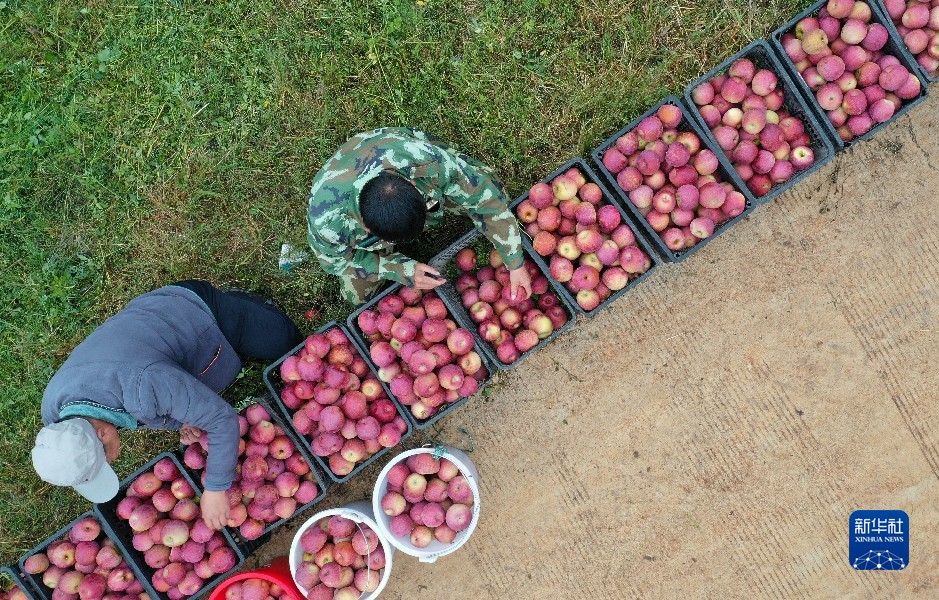10月21日,在贵州省威宁彝族回族苗族自治县牛棚镇龙山种植专业合作社的苹果园,曹杰的父亲曹宣明(右)和村民分拣刚采摘的糖心苹果(无人机照片)。新华社记者 杨楹 摄