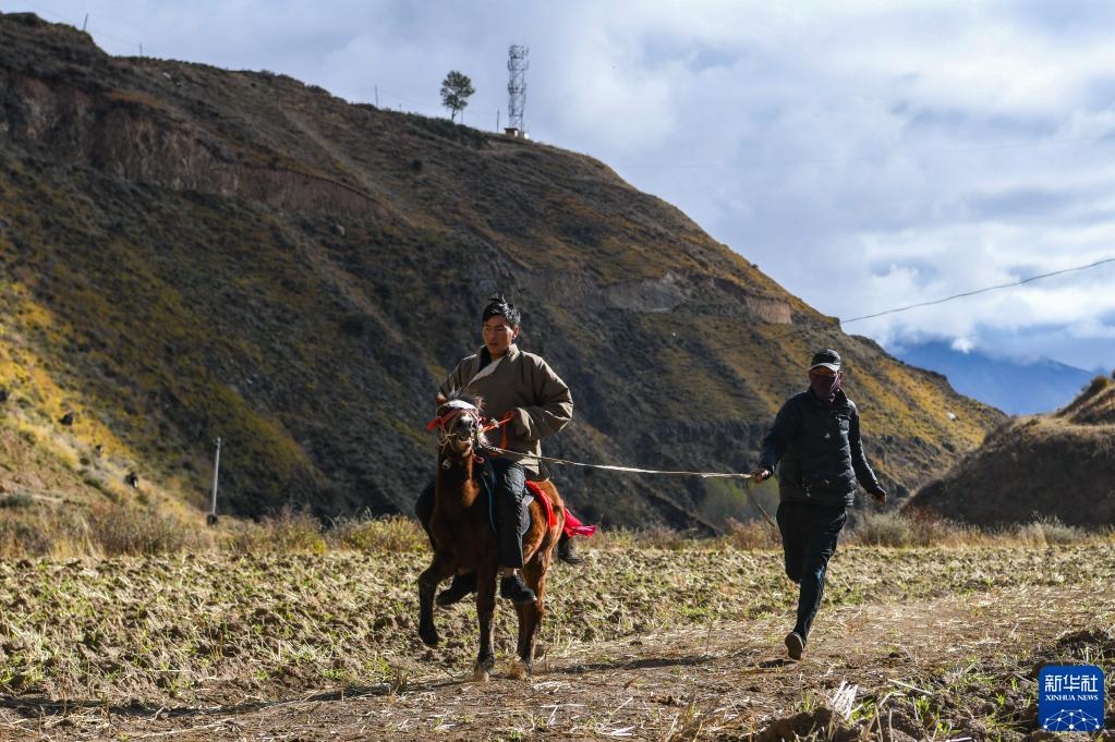 甘孜县来马镇格通村村民在驯化从合作社购买的幼马(10月25日摄)。