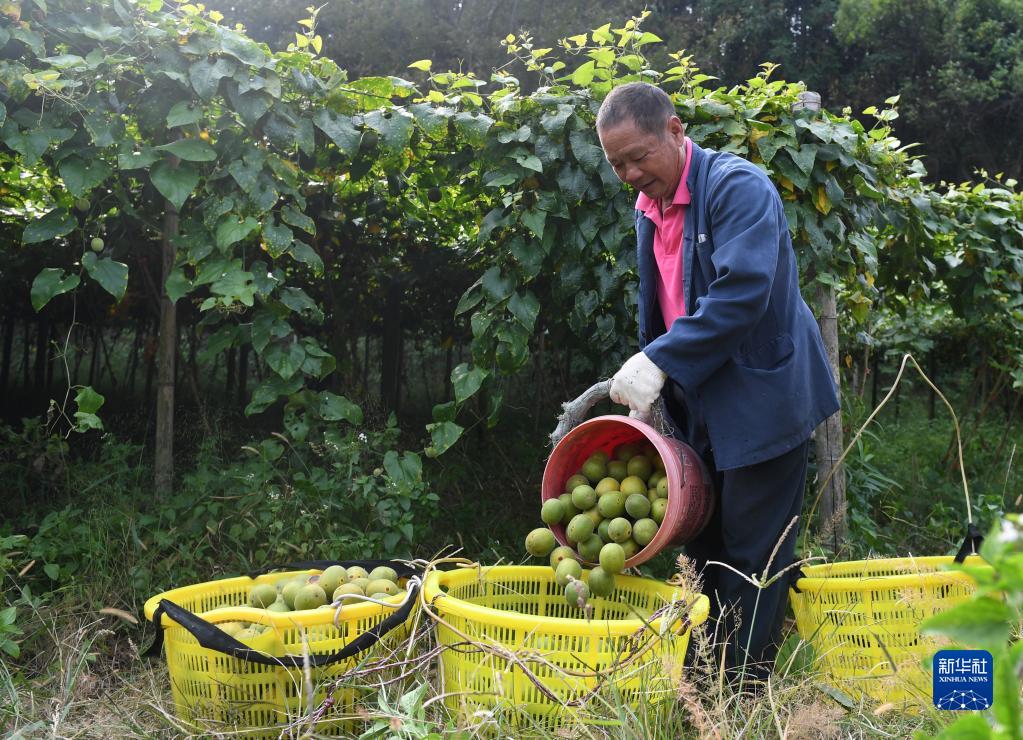 10月27日,在广西灵川县灵田镇正义村,当地农民将采摘的罗汉果倒入筐里准备挑回家。