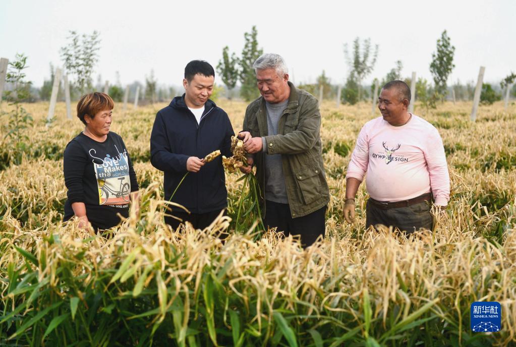 10月28日,新河县南马庄村驻村工作队队长刘云龙(左二)、党员付建华(右二)与村民一起查看生姜生长情况。