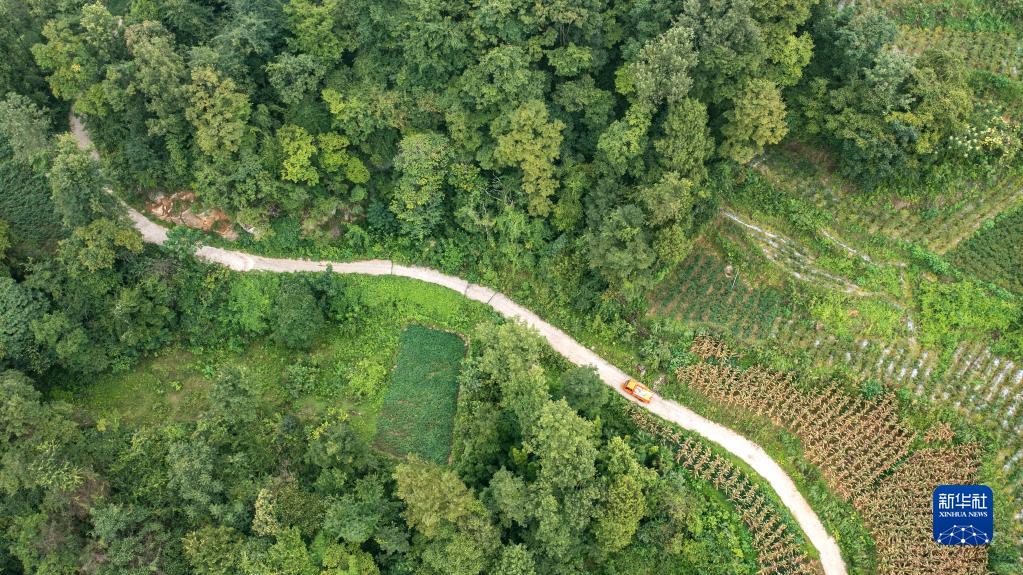 收购辣椒的小货车行驶在贵州省湄潭县梭塘村的乡间小路上(8月29日摄,无人机照片)。新华社记者 陶亮 摄