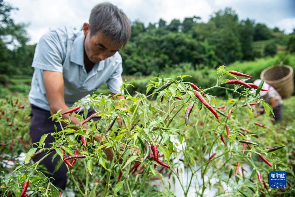 李伟在贵州省湄潭县梭塘村采收辣椒(8月29日摄)。新华社记者 陶亮 摄