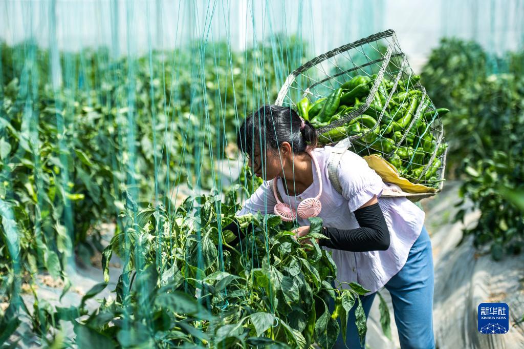 村民在贵阳农投集团奇申蔬菜基地采收牛角椒(7月29日摄)。新华社记者 陶亮 摄