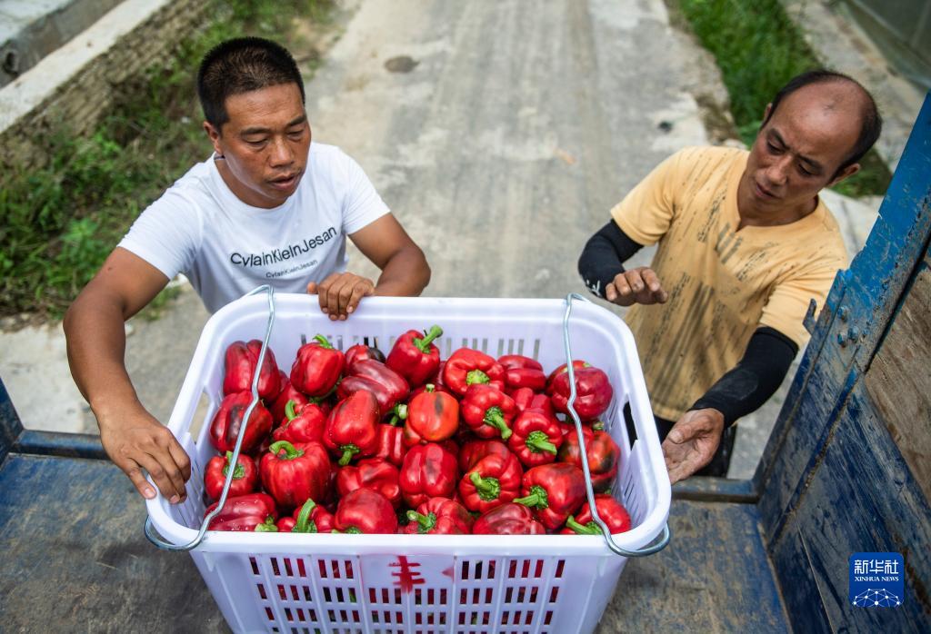 当地村民在贵阳农投集团花溪蔬菜基地将采收好的柿子椒装车(7月30日摄)。新华社记者 陶亮 摄