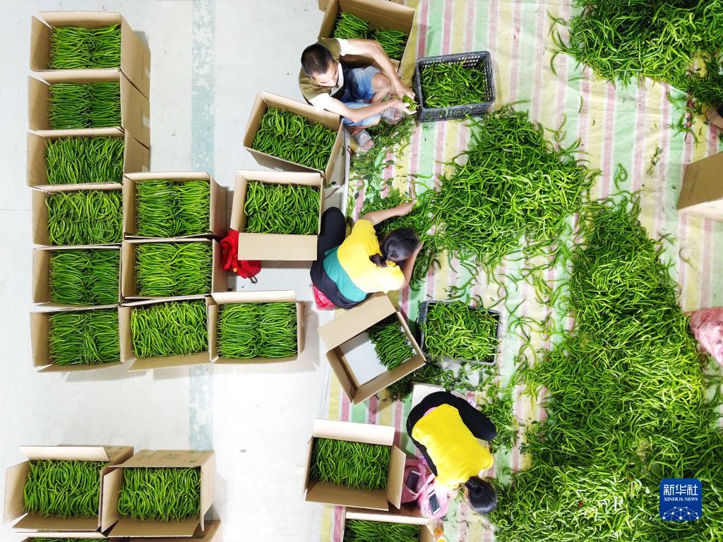 农民在贵州省榕江县车江坝区的蔬菜采选场分选辣椒(2020年6月2日摄,无人机照片)。新华社记者 杨文斌 摄