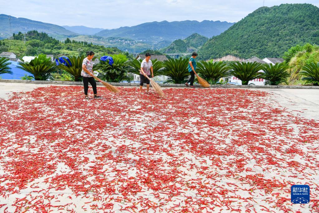 在贵州省思南县塘头镇青杠坝村幸福食品加工厂,村民在晾晒辣椒(2020年8月12日摄)。新华社记者 杨文斌 摄