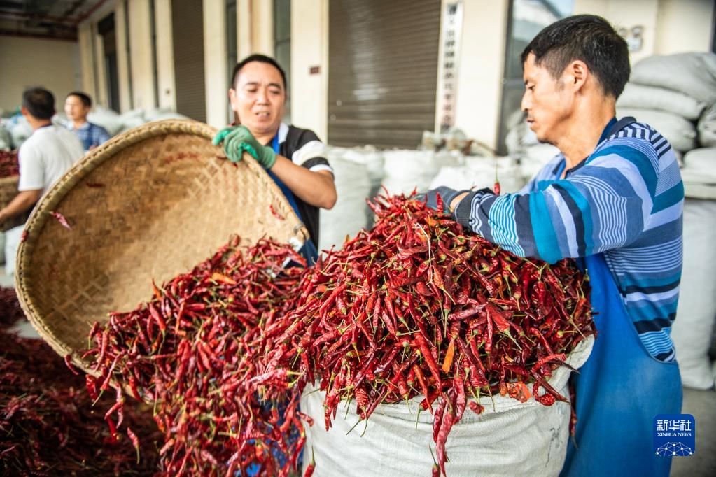 工人在遵义市新蒲新区中国辣椒城将辣椒装袋(8月29日摄)。新华社记者 陶亮 摄