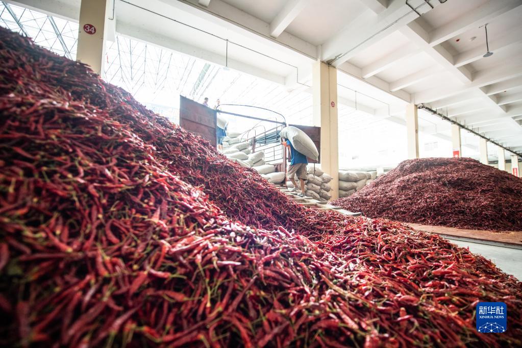 经销商从贵州省遵义市新蒲新区中国辣椒城摆放的辣椒前走过(2020年8月18日摄)。新华社记者 陶亮 摄
