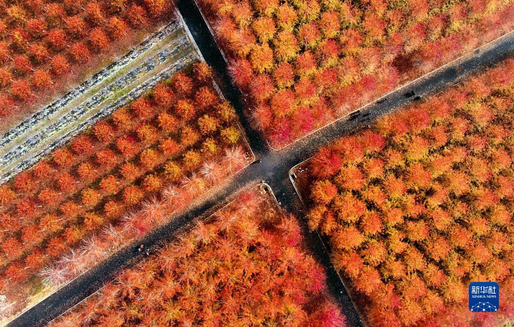 11月4日,游客在青岛西海岸新区张家楼街道张家楼村枫林赏景游玩(无人机照片)。