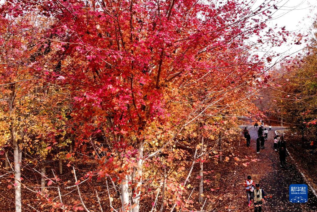 11月4日,游客在青岛西海岸新区张家楼街道张家楼村枫林赏景游玩(无人机照片)。