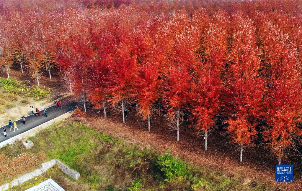 11月4日,游客在青岛西海岸新区张家楼街道张家楼村枫林赏景游玩(无人机照片)。
