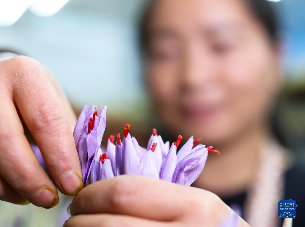 11月6日,贵州省岑巩县羊桥土家族乡祝坝村,村民在采摘西红花。新华社发(胡攀学摄)
