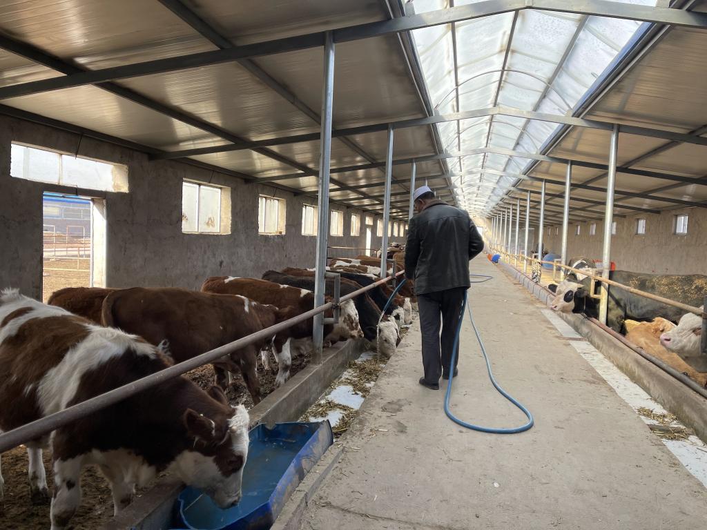 一座现代化钢架棚里,门窗通风,牛床干燥,40多头肉牛或站或卧,宁夏吴忠市同心县河西镇上河湾村脱贫户田正武正往水槽里放水。他的宝贝牛从家里的“刚需型”牛棚搬进村里养殖园区的“改善型”牛棚已有大半年,明年初就集中出栏了。他说:“这里宽敞,牛运动量大,肉质好,价钱能卖得更高。”