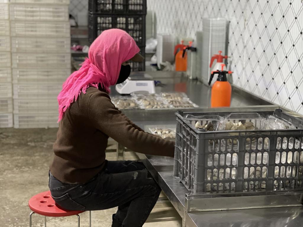 同心县下马关镇南安村蘑菇种植基地,女工正将精包装的蘑菇装筐(新华社记者马丽娟摄)