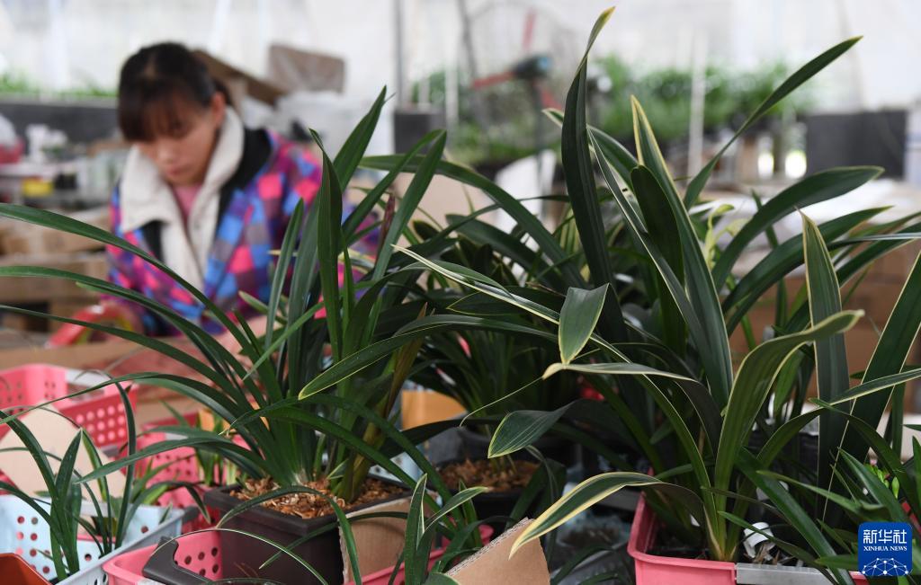 11月17日,在广东韶关翁源县德芳兰园有限公司,工作人员在给电商销售的兰花打包。新华社记者 邓华 摄