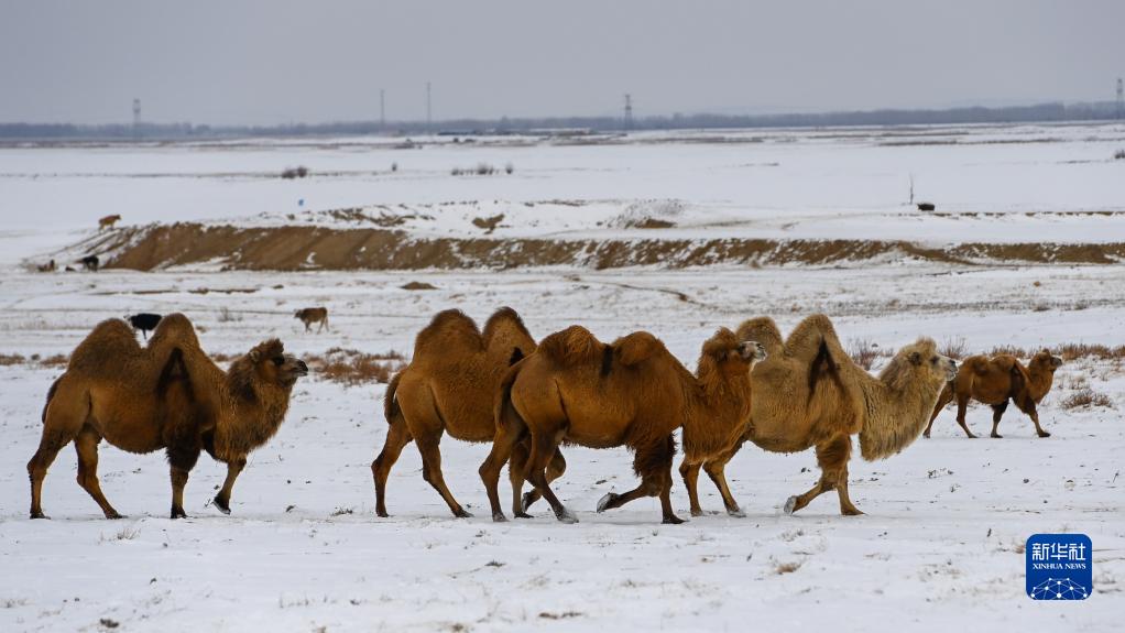 在新疆福海县齐干吉迭乡冬牧场,养殖户的骆驼在觅食(11月24日摄)。