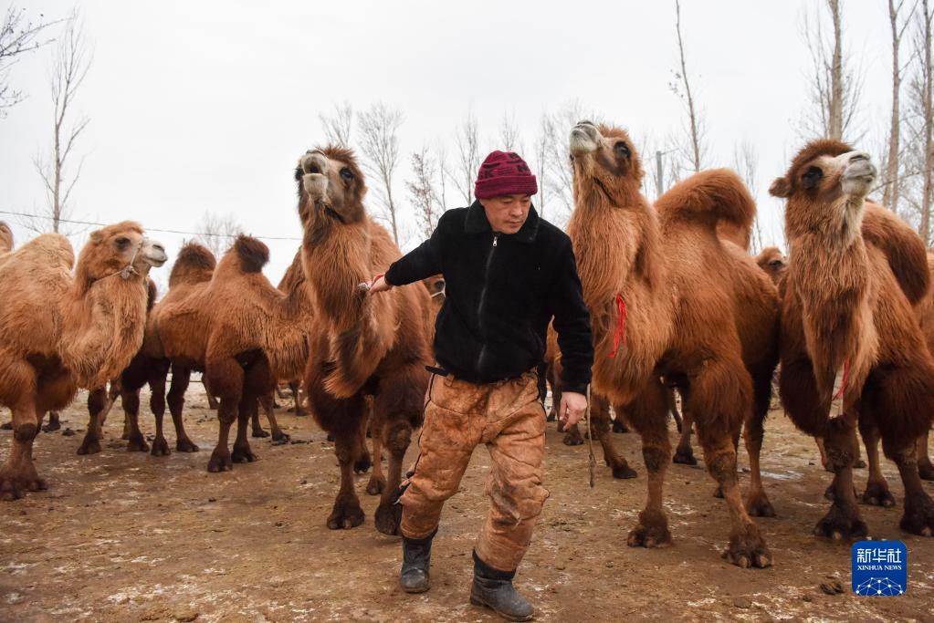 11月26日,在新疆福海县解特阿热勒镇,养殖户牵骆驼去挤奶。