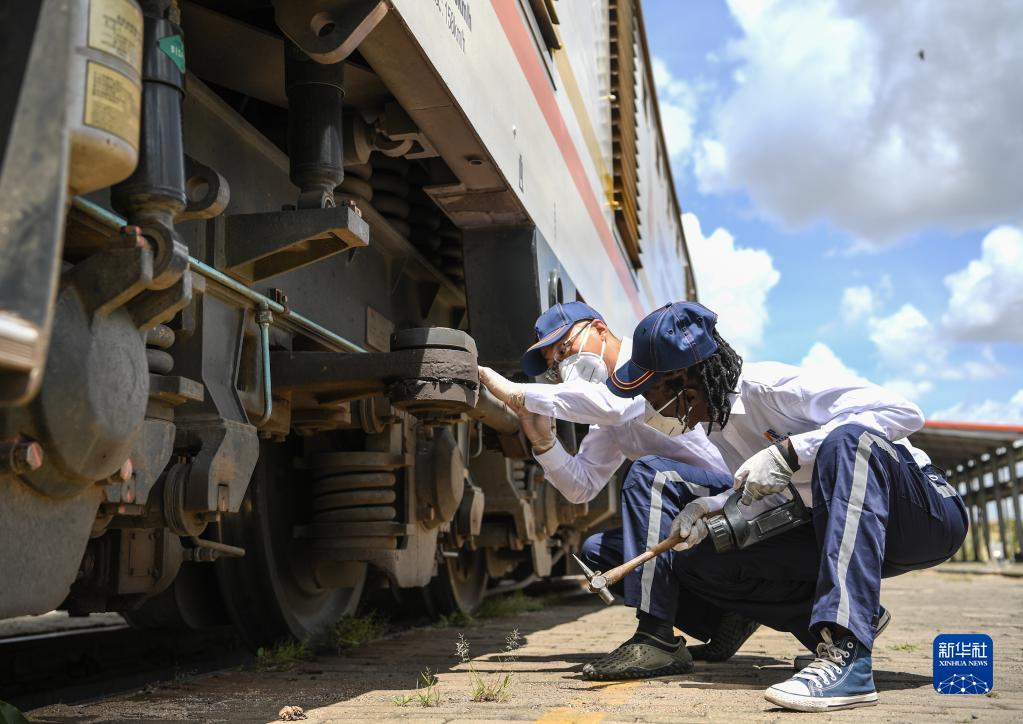 3月22日,在肯尼亚首都内罗毕,蒙内铁路指导司机杨明和他的肯尼亚女徒弟康西莉亚在检查机车。