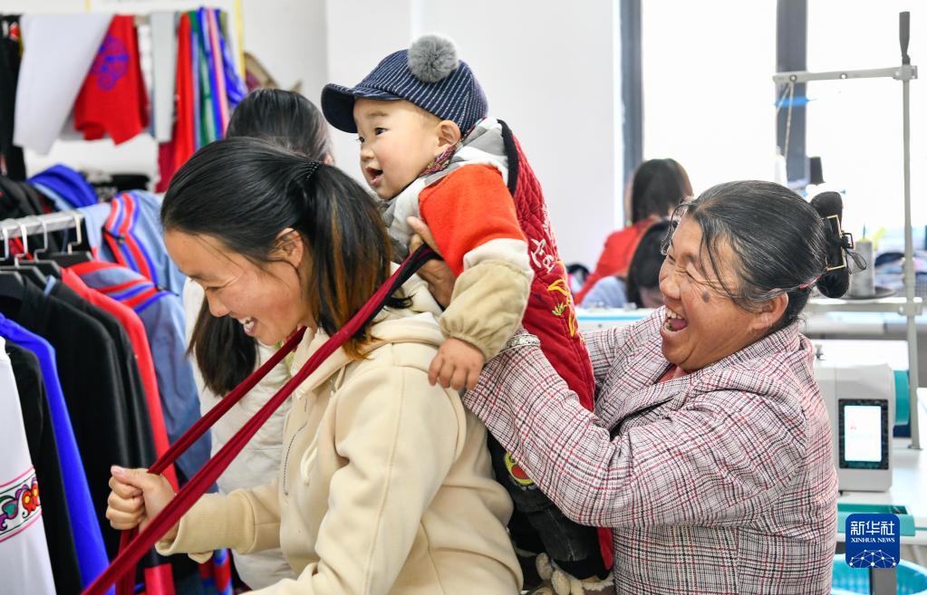 在贵州省威宁县五里岗街道朝阳新城易地扶贫搬迁安置小区,搬迁户在就业扶贫手工车间可以一边就业,一边带孩子(11月28日摄)。