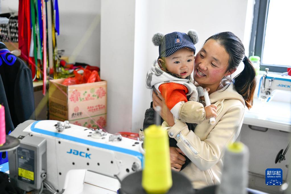 在贵州省威宁县五里岗街道朝阳新城易地扶贫搬迁安置小区,搬迁户在就业扶贫手工车间可以一边就业,一边带孩子(11月28日摄)。