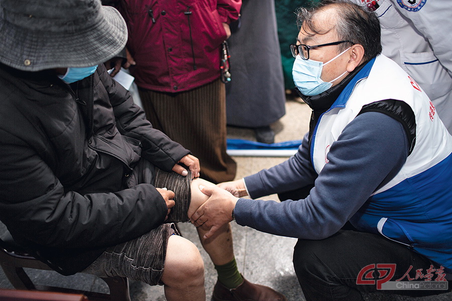 北京市第六人民医院孙祯杰医生为一当地患者诊断腿部情况。不久前,他刚刚荣获了“全国学雷锋最美志愿者”称号。
