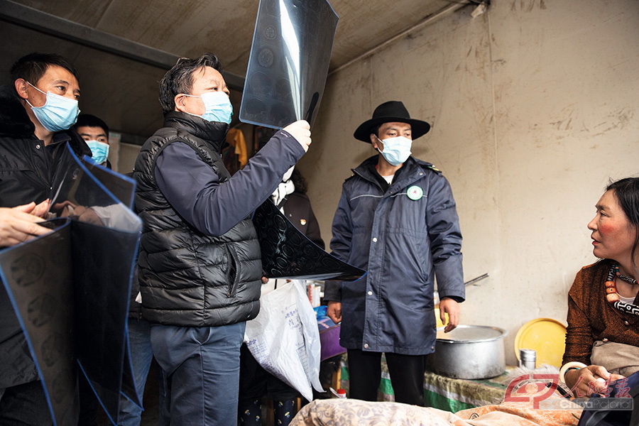 46岁的康吉(右一)因病已经卧床9年,得知这一情况,北京市第六医院院长刘肆仁(左一)与医疗组成员从义诊点驱车1个多小时来到她家中问诊、治疗。