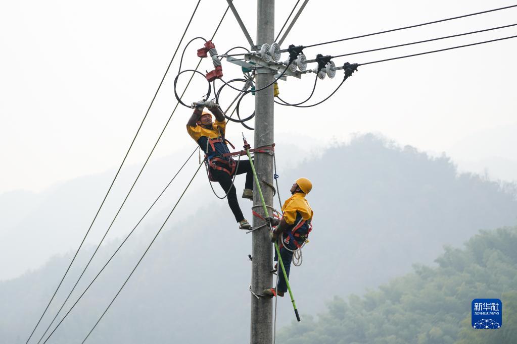 12月8日,国网霍山县供电公司施工人员在霍山县磨子潭镇对电网进行升级改造。