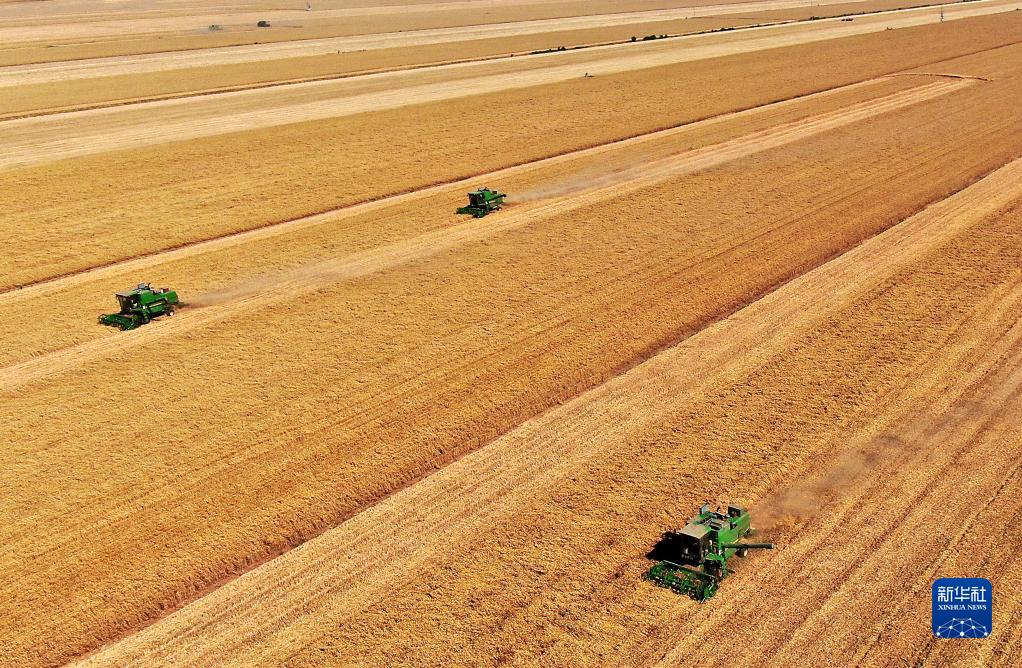 在河南省黄泛区农场九分场的麦田里,农机手操作收割机收获小麦(无人机照片,6月6日摄)。