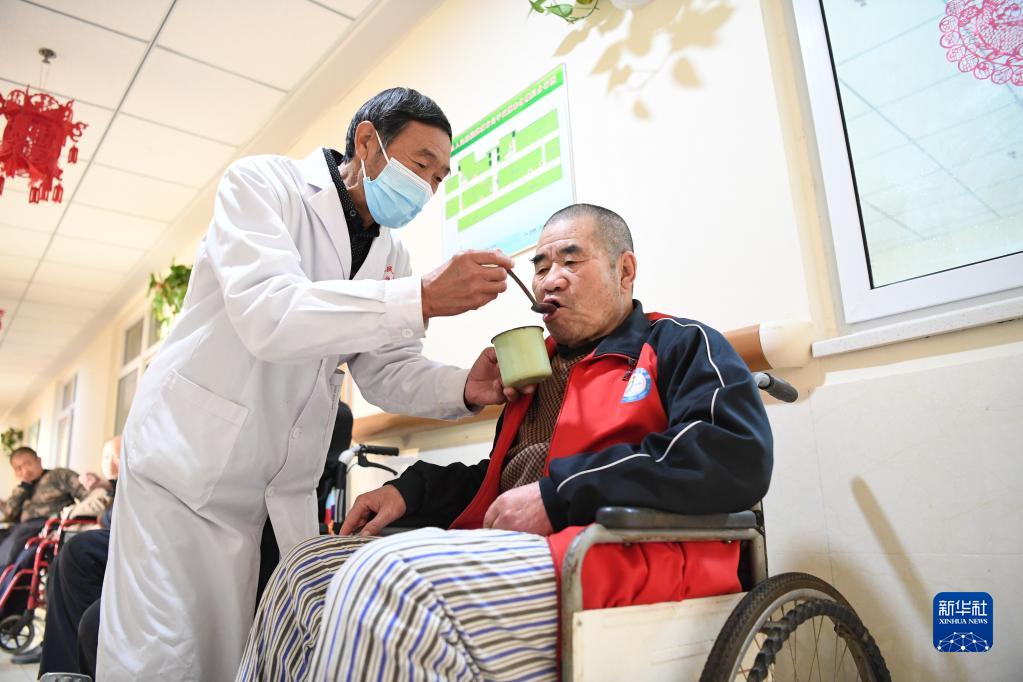 12月28日,河北省景县人民医院医养中心工作人员帮助老人喝水。