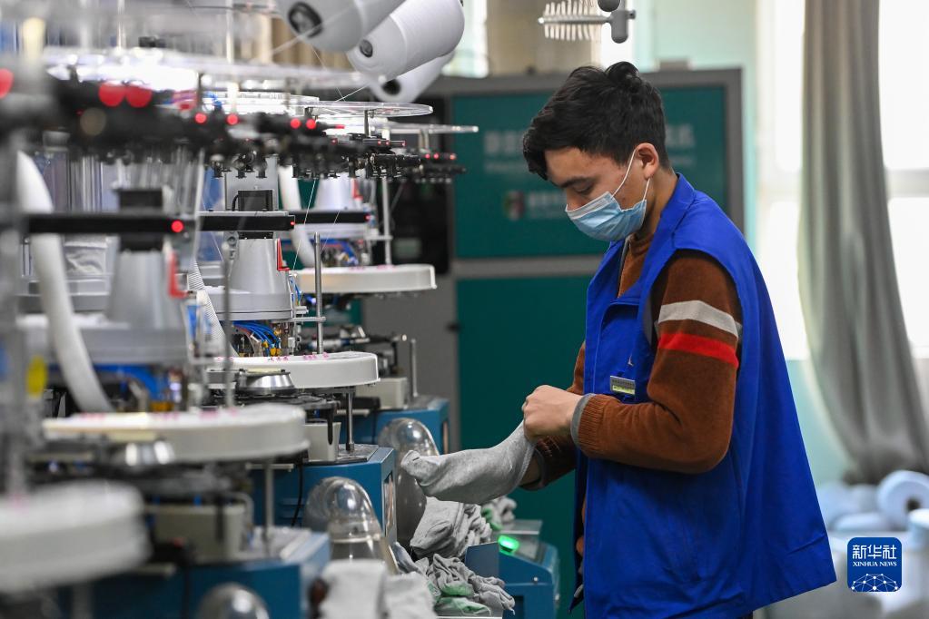 1月11日,在新疆墨玉县产城融合园,新疆美旭纺织有限公司的员工在检查生产的袜子质量。新华社记者 丁磊 摄