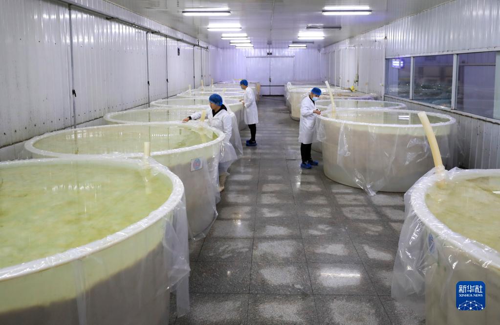 1月10日,鞍山市千山区汤岗子村村办酸菜厂的工作人员在查看酸菜发酵情况。