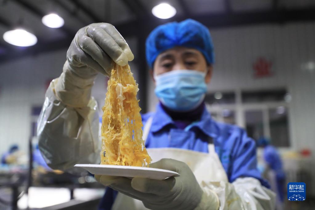 1月10日,鞍山市千山区汤岗子村村办酸菜厂的工作人员展示切好的酸菜丝。