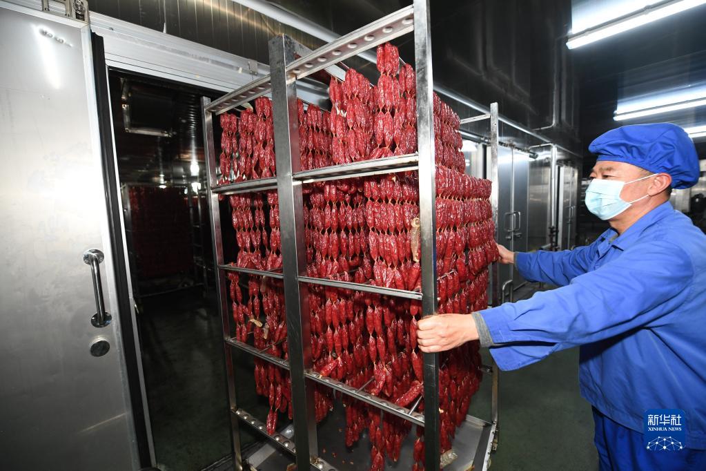 1月13日,在位于湖州道场乡老字号产业园的一公司车间内,工作人员准备烘制传统香肠。
