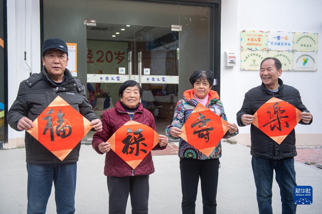 1月18日,江北区桃源小区的居民拿着写好的字在“长者之家”门口合影。该小区老年人居住比例较高,在老旧小区改造过程中,街道将小区内闲置用房改造成集老年大学、幼儿托管等为一体的“长者之家”。新华社记者 江汉 摄