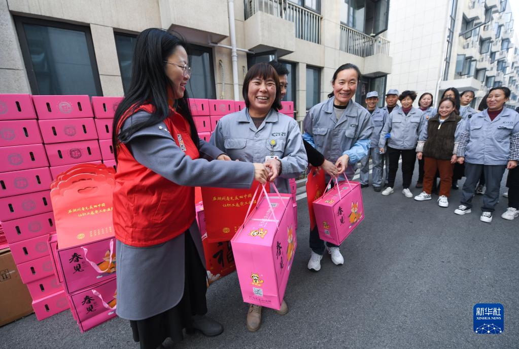 1月19日,织里镇总工会的工作人员在一家企业内给留下过年的外地员工送上水果和福袋。
