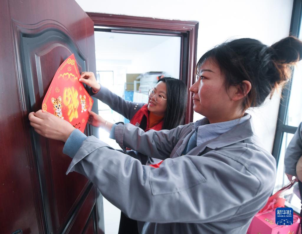 1月19日,织里镇总工会的工作人员在一家企业的员工宿舍内同外地员工一起贴福字。