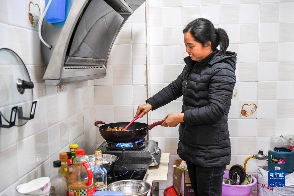 1月18日,一名生活在广西兴业县“老乡家园”的居民在家中做晚饭。