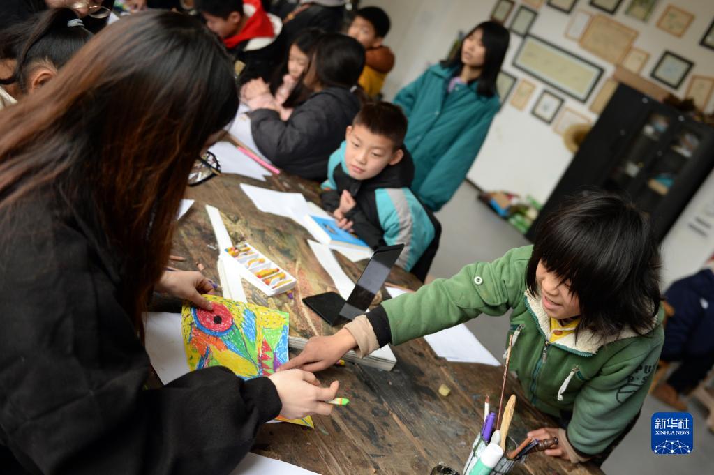1月18日,大元社的小朋友和老师在交流绘画作品。新华社记者 陈振海 摄