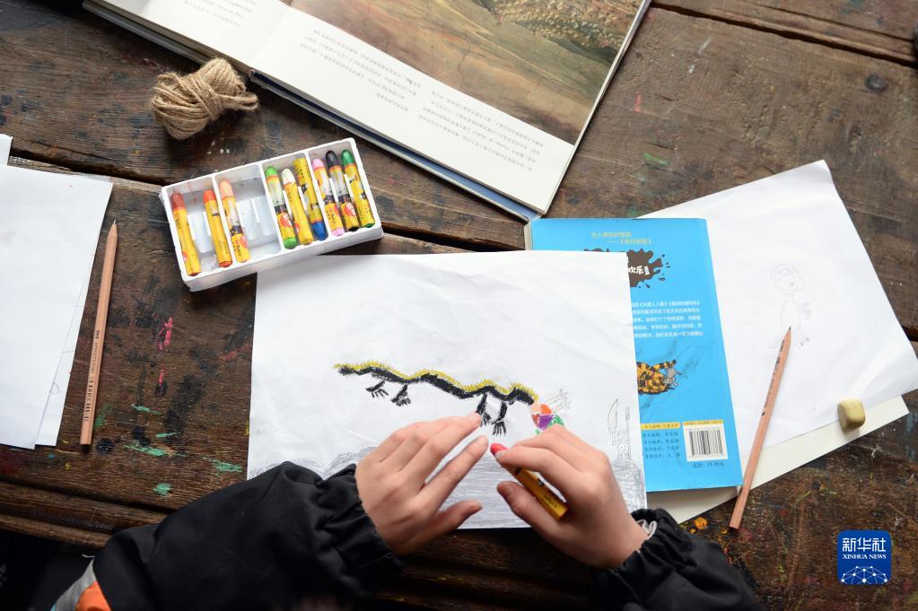 1月18日,小朋友在大元社里画画。新华社记者 陈振海 摄
