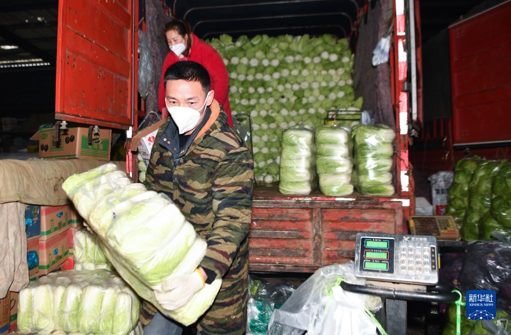 1月24日,在西安市胡家庙蔬菜批发市场,工作人员搬运即将投放市场的储备菜。