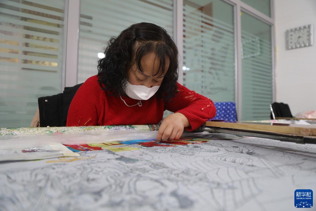 1月24日,绣娘石玉秀制作藏绣作品《格萨尔王》。