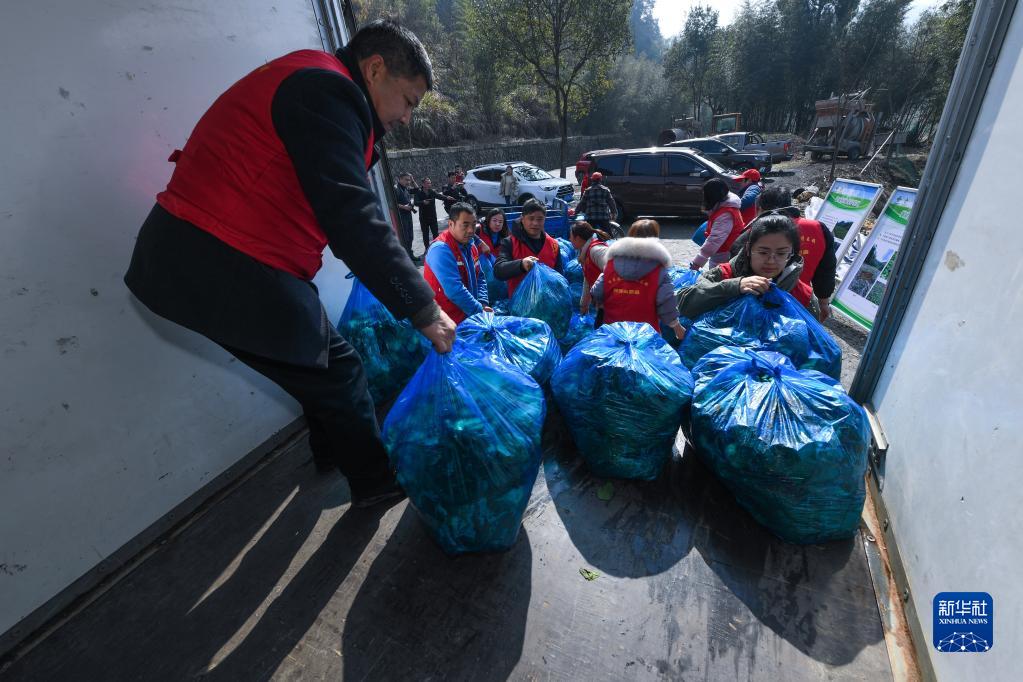 2月24日,在杭州市淳安县临岐镇新华村蔬菜种植基地,志愿者们把采收的蔬菜搬运上“供富大篷车”,直供到杭州、上海等地的超市和门店。