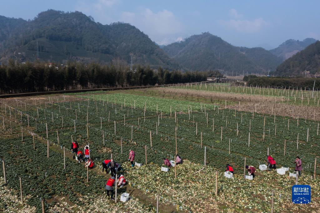 2月24日,在杭州市淳安县临岐镇新华村蔬菜种植基地,志愿者和村民一起采收蔬菜(无人机照片)。