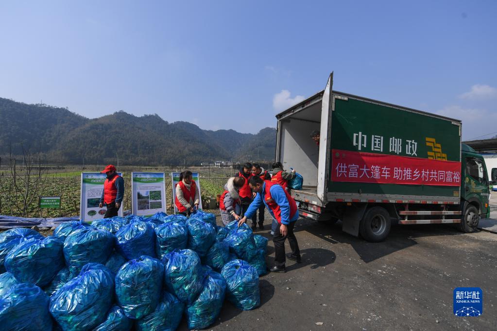2月24日,在杭州市淳安县临岐镇新华村蔬菜种植基地,志愿者们把采收的蔬菜搬运上“供富大篷车”,直供到杭州、上海等地的超市和门店。